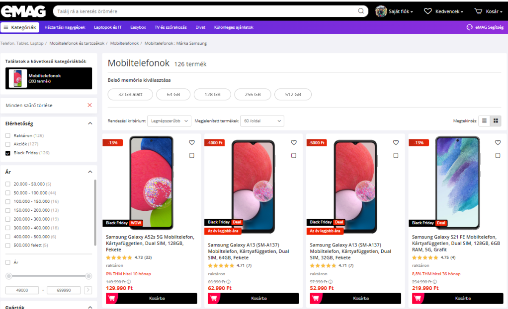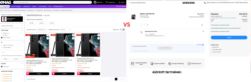 | Galaxy S22 Ultra 5G 256GB | 479 990 Ft | 499 491 Ft | 449 542 Ft | 359 542 Ft |