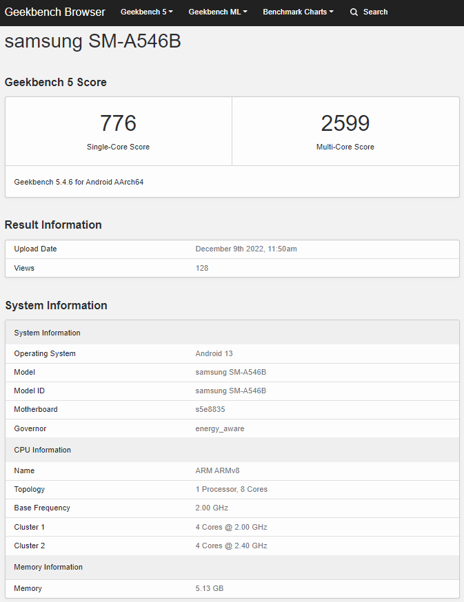 Erre utaló nyom, hogy a Galaxy A54 5G feltűnt a Geekbench oldalán egy sebességteszten. A logolt adatlapja szerint az S5E8835 típusszámú lapka szolgáltatja majd az erőforrását, ami vélhetően az Exynos 1380 lesz. A nyolcmagos processzor két négymagos tartományra lett felosztva, melyek közül a terhelhető négyes 2.4GHz-en, míg az energiatakarékosabb 2GHz-en teszi a feladatát. Mondanom se kelljen, de utóbbi lesz az alapértelmezett, hiszen a cél a hosszabb üzemidő. RAM tekintetében 5,13GB-ot mutat a felület, azaz most se várható, hogy a Samsung szintet lép, és 8/128GB-val örvendezteti meg a leendő felhasználóit, csak 6GB-t pakolnak bele, mert a jelek szerint mindez bőven elegendő.