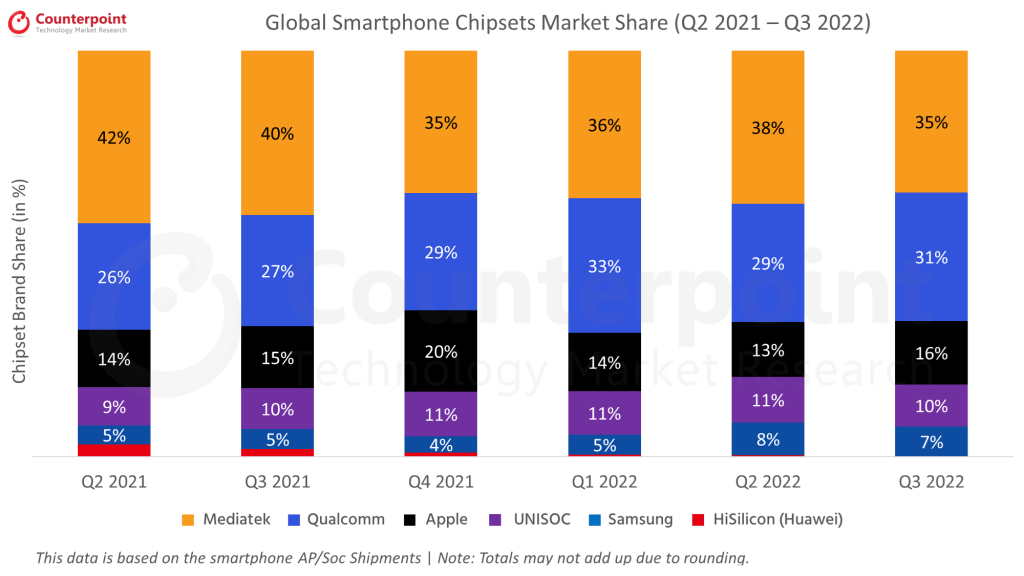 Piacvezető helyüket sikerült megtartani 2022 harmadik negyedévében is, attól függetlenül, hogy mind az előző időintervallumhoz, mind pedig a tavalyi azonoshoz képes csökkenést mutatkozott. A Counterpoint Research kutatásából kiderül, hogy a piac 35%-át tudhatják magukénak. Igen ám, viszont 2021 második negyedévében 42%-on álltak, amihez képest elmaradásról beszélgetünk, ahogy 2021/Q3-hoz képest is, amikor 40%-on.
