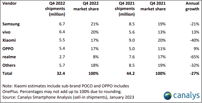 Az indiai okostelefon piacának visszaesését mindegyik gyártó megérezte. Az elmúlt 2 évben ilyen csökkenést nem tapasztaltak; melynek mértékű 27%-os volt, A hanyatlás egyébként 2022/Q3-ban ütötte fel elsőként a fejét, bár akkor csekély 6%-ot könyvelte k mellé.