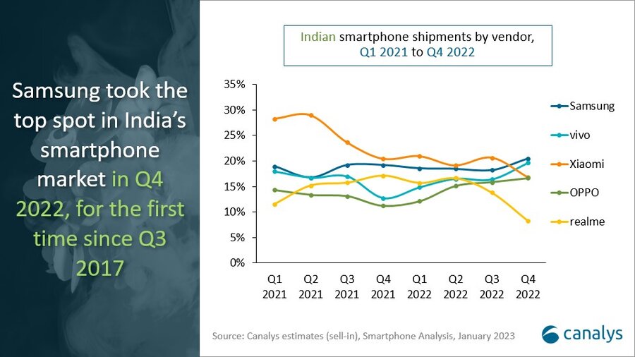A Samsung számára azért történelmi mérföldkő 2022 utolsó negyedéve, ugyanis utoljára 2017 harmadik negyedévében sikerült felállnia az indiai okostelefon-piacának legfelsőfokára. Sikeréhez kellett a Xiaomi és a RealMe örült lecsúszása. 2022/Q3-ban előbbi 9.2 millió, utóbbi 6.2 millió terméket szállított le; ehhez képest az utolsó időszakban mindez lecsökkent 5.5 millióra, valamint 2.7 millióra. Ha éves viszonylathoz, azaz 2021/Q3-hoz mérjük a beérkezett adatokat, akkor mind a két gyártó mellé legalább 40%-os bukás írható fel.
