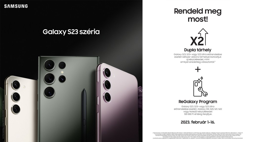 | Galaxy S23+ 5G | 8/256GB → 8/512GB | 524 990 Ft | Fantomfekete (SM-S916BZKDEUE) Levendula (SM-S916BLIDEUE) |
