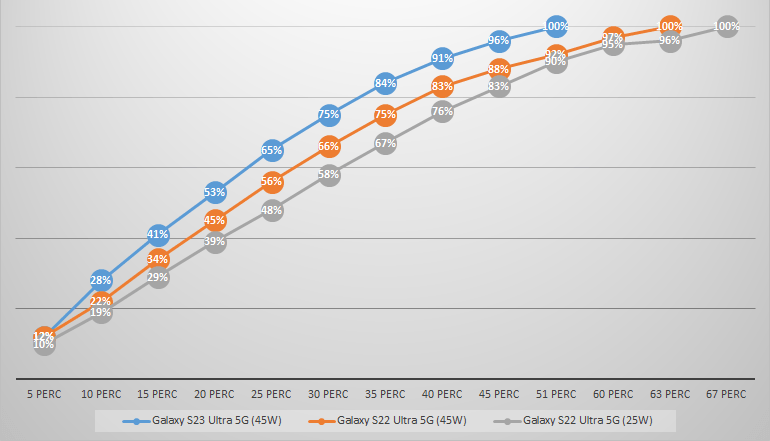 A Galaxy S22+ 5G és a Galaxy S22 Ultra 5G is már rendelkezett 45W-os gyorstöltési lehetőséggel, amelyet természetesen az utódok is megkaptak. Sajnos még nincs mindenről teszt, így csak szűk körben vizsgáltam meg, miként teljesített a Galaxy S23 Ultra 5G az elődjéhez, a Galaxy S22 Ultra 5G-hez képest. Utóbbi esetében viszont vannak adataink 25W-os szimpla töltéshez és 45W-os szuper gyorstöltéshez – még ha ez a szó nem éppen a leghelytállóbb.