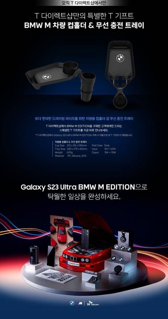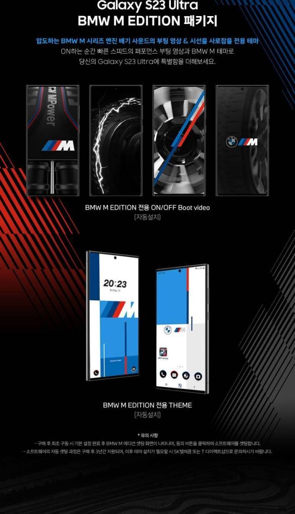 A Galaxy S23 Ultra BMW M Editon-t kifejezetten a BMW M3 E30, azaz az M3 első generációja ihlette. Az exkluzív csomagban számos BMW kellék található, mint pl.: egy tematikus tok, egy kulcstartó hat cserélhető emblémával (a hat különböző korszakból), egy napszemüveg és egy szellőrostélyba illeszthető óra. Nem utolsó sorban, egy fém logó a We are M felirattal, egy fotókönyv, egy BMW márkájú akkumulátoros légkompresszor, illetve egy vezeték nélküli töltő.