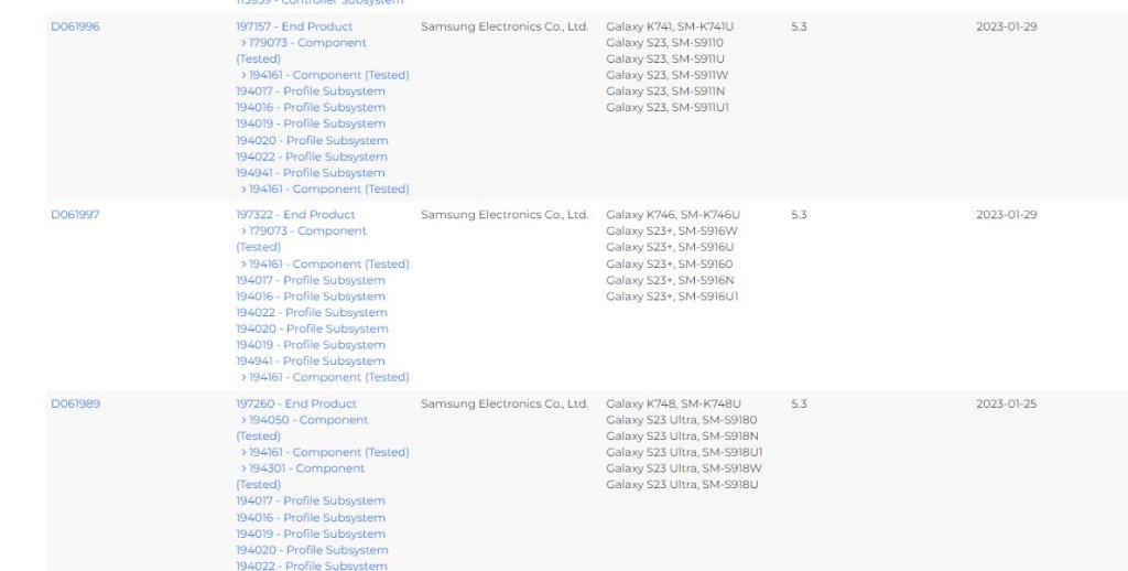Mint azt említettem, tavaly novemberben tűntek fel az első bejegyzései az indiai régióban. Az ‘SM-K748B/DS’, az ‘SM-K746B/DS’ és az ‘SM-K741B/DS’ trió esetében talán azért se asszociáltunk arra, hogy ez a Galaxy S23 termékcsalád, mert ravaszul odaírták mellé az SM-S91x típusszámú megfelelőjét; illetve a Galaxy S23 Ultra 5G sorában ott szerepelt egy belépőszintű modell, az ‘SM-A146B/DS’, amiről már tudjuk, hogy a Galaxy A14 5G.