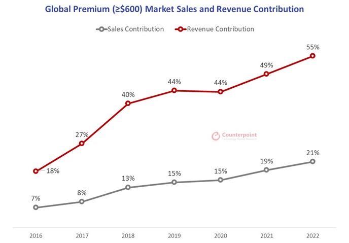 Előjáróban viszont annyit mindenképpen meg kell említenem, hogy 2022-ben a globális okostelefon-eladások 12%-kal csökkentek az előző esztendőhöz képest. Ez szomorú tény a márkáknak, viszont a rossz a jóban, hogy a globális prémium szegmens ezzel szemben 1%-kal erősödött; és határozottan hozzájárult ahhoz, hogy az okostelefon-piaci bevétele még több legyen, ugyanis annak 55%-át tette ki.