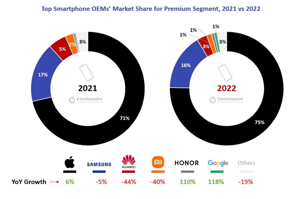 Ha a prémium piac eloszlására vettek egy pillantást, akkor észrevehető, hogy a vásárlók háromnegyede választja az Apple-t a 600 dollár feletti ársávban. Ezzel szemben a Samsung mindössze 16%-ot tud felmutatni – tavalyelőtthöz képest házrész arányban vesztett 1%-nyit.