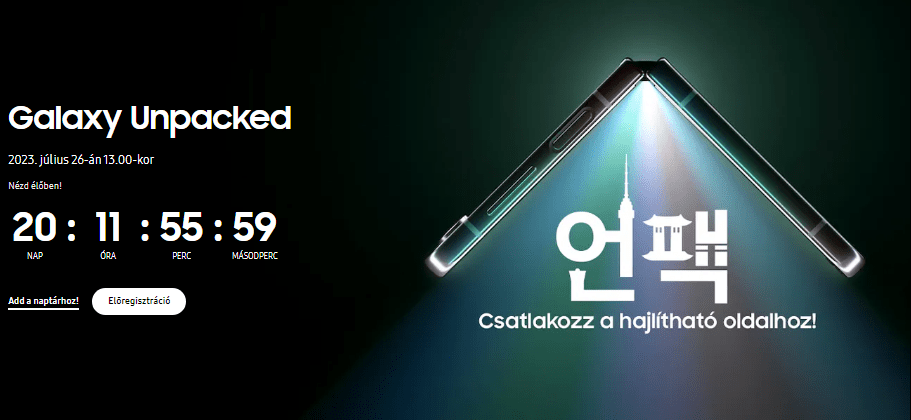 A Samsung Magyarország – és persze a többi képviselet – hajnali 1 órakor élesítette a https://www.samsung.com/hu/unpacked/ domain címét, azaz a Galaxy S23 lekerült az átirányítási felületről, melynek helyére a soron következő prémium MX termékekre fókuszáló teaser került. Ezzel egyidejűleg pedig már az sem titok, hogy 2023. július 26-án (szerdán) 13 órás kezdéssel mutatják be a hajlítható készülékek új generációját – illetve még a Galaxy Tab S9- és a Galaxy Watch6 termékcsaládot; valamint a Galaxy SmartTag2 és Galaxy Buds3 kütyüket, ha lehet hinni a külföldi híreszteléseknek.