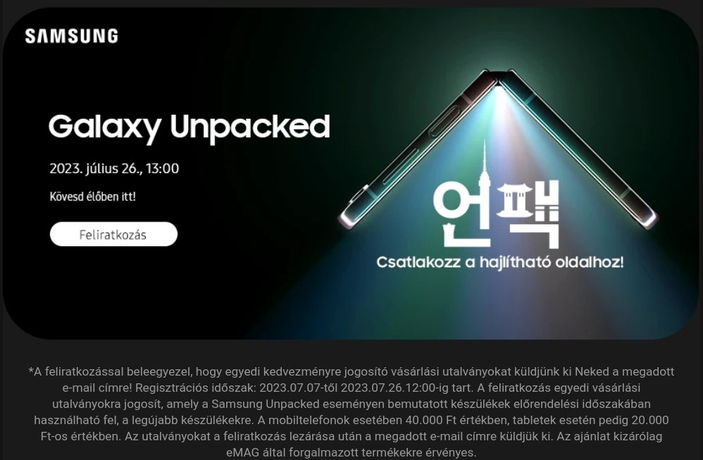 *A feliratkozással beleegyezel, hogy egyedi kedvezményre jogosító vásárlási utalványokat küldjünk ki Neked a megadott e-mail címre! Regisztrációs időszak: 2023.07.07-től 2023.07.26.12:00-ig tart. A feliratkozás egyedi vásárlási utalványokra jogosít, amely a Samsung Unpacked eseményen bemutatott készülékek előrendelési időszakában használható fel, a legújabb készülékekre. A mobiltelefonok esetében 40.000 Ft értékben, tabletek esetén pedig 20.000 Ft-os értékben. Az utalványokat a feliratkozás lezárása után a megadott e-mail címre küldjük ki. Az ajánlat kizárólag eMAG által forgalmazott termékekre érvényes.