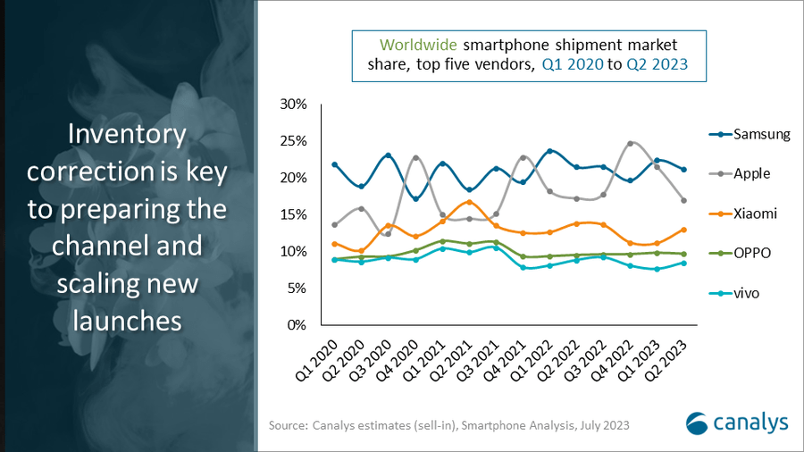 Míg az első negyedévben az Apple brillírozott, amit legfőképpen annak köszönhet, hogy a vásárlói az ünnepi időszakot követően kötelezték el magukat a brand mellett; addig mostanra a csökkenés őket sem kímélte. A Samsung továbbra is piacvezető globális viszonylatban. Jelenleg 21%-os szeletet ragad ki az összből, majdnem ugyanannyit, mind az év első három hónapjában, illetve a 2022-es azonos időszakban.