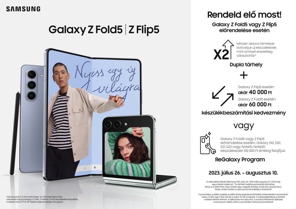 Az ajánlatok között egy választható is szerepel. Bekerült az Galaxy Z 5 termékcsalád a ReGalaxy programba, azaz, van lehetőség bruttó 100 ezer forint értékben régi Galaxy S- és Note-szériás készülékeket felújítatni. Ezt a promóciót viszont csak akkor fogjátok tudni igénybe venni, ha nem számíttatok be régi terméket az új vásárlásába. Mindenki döntse el maga, melyikkel jár jobban. Ha netán a trade-in mellett tennétek le a voksotok, akkor a régi modell árán felül, további legalább 40 000Ft-os végösszegi kedvezményben részesül. A beszámítható kütyük listáját az alábbi linkre klikkelve találjátok. Ha itt nem szerepel, akkor sajnos nincs lehetőségetek ennek az ajánlatnak az érvényesítésére.