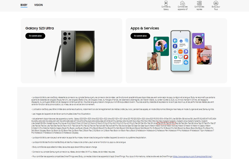 Történt ugyanis, hogy a francia képviselet egyik aloldalát, a Bixby-hez kapcsolódót naprakésszé tették, ami alatt értsétek azt, hogy a virtuális asszisztens bemutatkozó oldalán feltűntetett kompatibilitási listába minden modell felkerült – még olyanok is, amelyek megjelenése a jövőben lesz esedékes. Jelen esetünkben: a Galaxy Tab S9 FE-é és a Galaxy Tab S9 FE+-é.