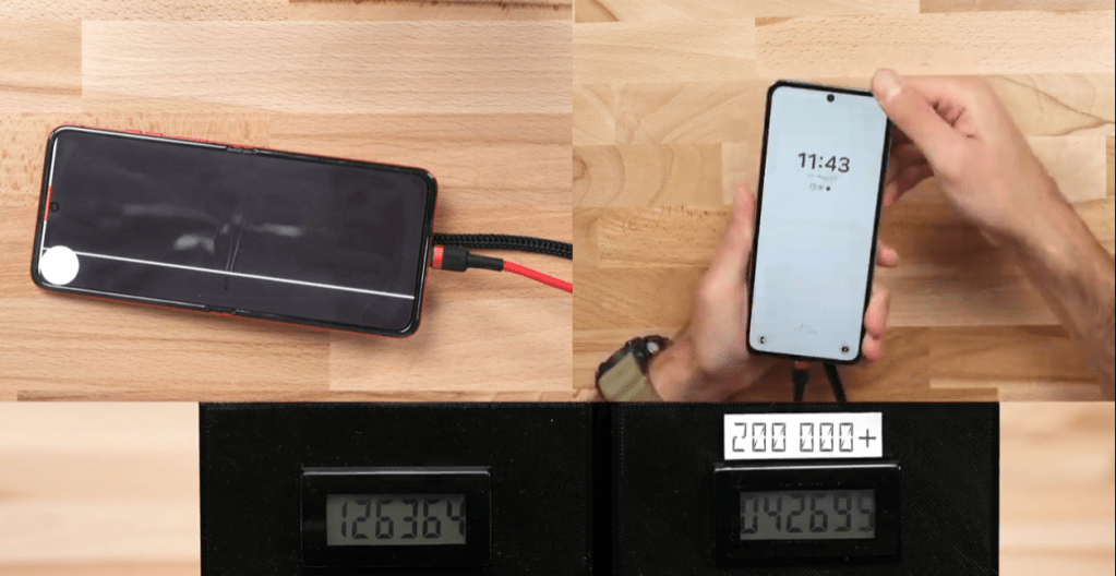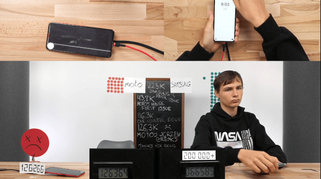 Ám egy teszt, nem teszt. Mind a két modellből lett egy újabb, érintetlen változat, így a második forduló is útjának indult. Amikor a Galaxy Világa bekapcsolódott a történésekbe, akkor 126 364 hajtást követően a Motorala Razr 40 Ultra megadta magát. Ezzel szemben, ha jól értelmezem a csapat kiírását, akkor – a Samsung által ígért – 200 ezer hajlítást a Galaxy Z Flip5 simán letette már az asztalra, és már ott tartanak, hogy +42 273 darabot hozzátett mindehhez, azaz a gyártó által írtakat hozza, ahogy kell.