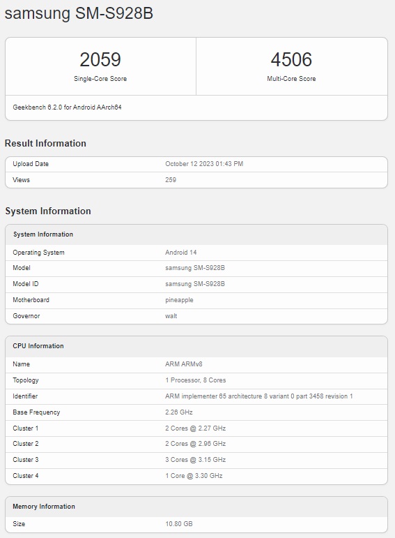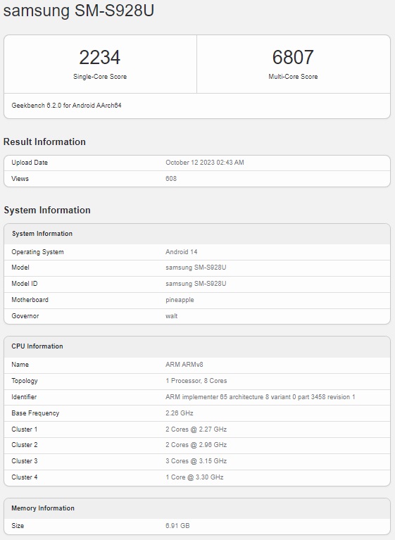 A két eltérő régiós teljesítménytesztben vannak egyezések. Az egyik ilyen, hogy mind a két modellnél Android 14 szolgáltatta az alapoperációs rendszer, amelyen vélhetően egyelőre még a One UI6 verziója érvényesülhet, némi újdonságokkal. Értelemszerűen, a One UI 6.1 majdcsak a debütálásakor lesz elérhető, viszont addig még jöhetnek új funkciók a mostani állapothoz viszonyítva. A másik a lapka mivolta, amely a Snapdragon 8 Gen 3 for Galaxy lenne, melyet pineapple-ként hív a chipset gyártó – mármint a még Samsung által „hangolatlan” változatot. Eszerint, az alábbi felosztással számolhatunk: