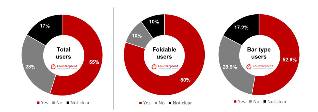 Kutatásuk során megkérdezték az átlagembert az Egyesült Államokban, Kínában és Dél-Koreában, hogy hajlandóak lennének-e összehajtható készüléket vásárolni következő okostelefon vásárlásuk során, amelyre eléggé meggyőző eredmények születtek! Először is a válaszadók 55%-a döntene biztosan mellette, míg 28% utasítaná el a gondolatát is annak, hogy belevágjon egy foldable használatába. Aki már használója, azok négyötöde nem “fokozná” vissza magát.