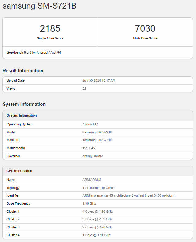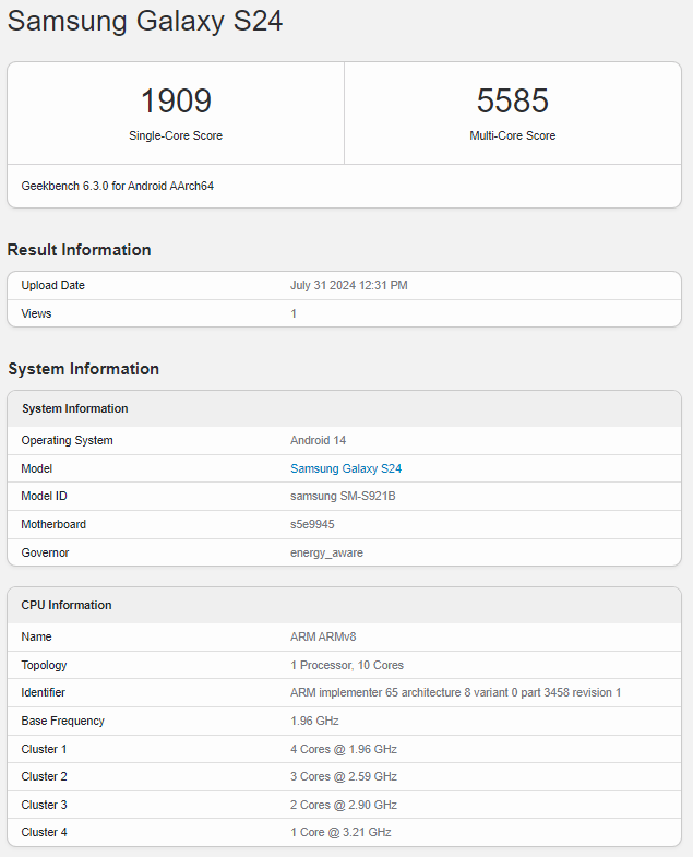 Az egyik bizonyíték minderre a Geekbenchen megfuttatott modellek tesztértékei. A legeslegelső júniusban tűnt fel, ami leleplezte, hogy ugyanazon Exynos 2400-gyel kerülhet piacra, mint a Galaxy S24 és a Galaxy 24+ bizonyos régiókban, mint pl.: Európában. Az s5e9945 motherboard besorolás egyértelműsíthetné a kilétét, viszont a részletekben rejlik a csavar, ugyanis ez nem az az Exynos 2400, mint ami az alapszériában helyet foglal.