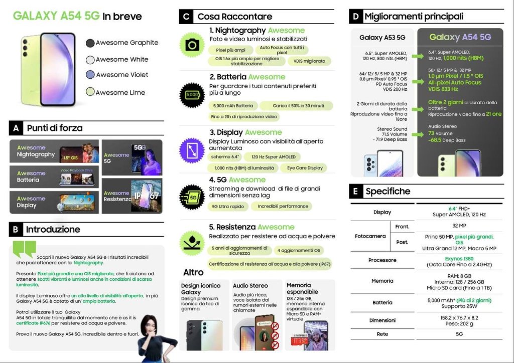 Majd pedig a közkedveltebb Galaxy A54 5G-ét, amelyet szintén összehasonlítottak a Galaxy A53 5G-vel, valamint felhívták a figyelmet arra, milyen fontos tények szólnak mellette:
