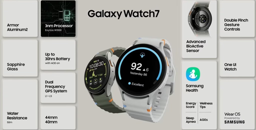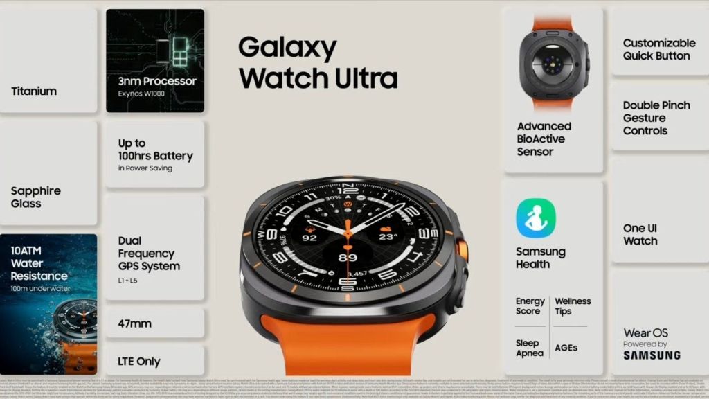 Most inkább foglalkozzunk az új termékek főbb tudásaival. A Samsung Global készített mindegyikhez infografikákat, azaz egy fotóba préselték azokat a jellemvonásokat, amelyben kitűnik egyik-másik. Kezdjük a Galaxy Watch Ultra-val a sort, ami a legjelentősebb változáson esett át.