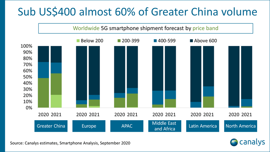 Egy másik diagramot is kreáltak, ami arra fókuszálna, hogy mely árzónákban fut/futhat jobban az 5G képes portfólió. Látszik rajta, hogy míg Kínában nagyon eloszlik a piac, addig a többi régióban inkább a 600 dollár feletti készülékekre nyitnak majd a felhasználók, azaz a csúcskategóriásokra. 2020-ban a kínai piacon majdnem 50%-os a 200 és 399 dollár közötti termékek iránti érdeklődés, ami, míg az afeletti árszegmenseknél 25-25%-ra csökken. A Canalys jóslata arról számol be, hogy még inkább hígulni fog.