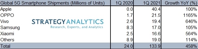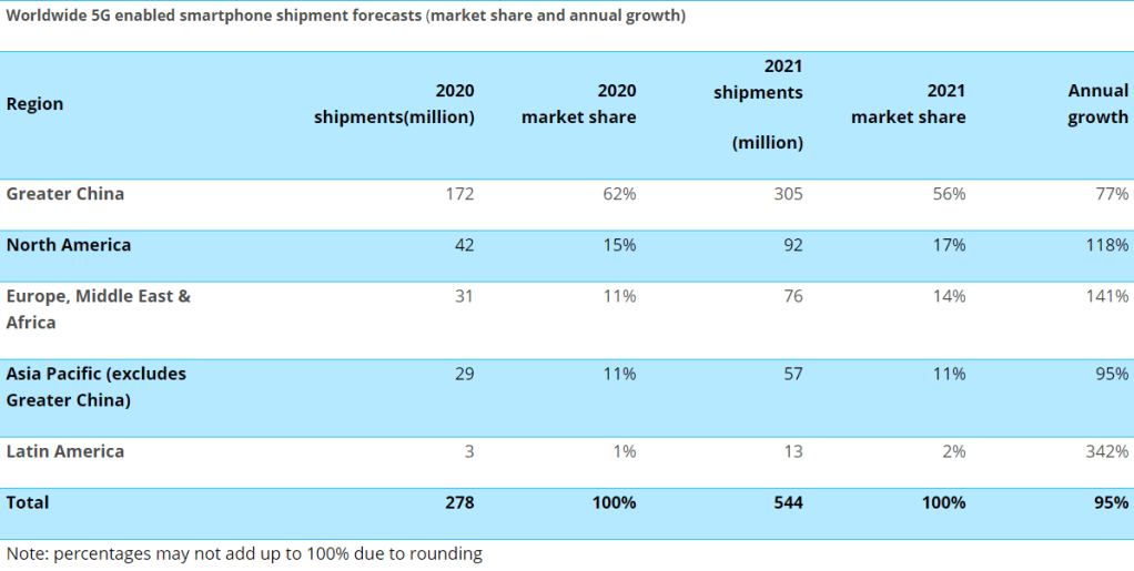 2020-ban kezdett úgy istenesigazából kibontakozni az 5G képes okostelefonok piaca, amely az év második felében vett egy intenzív fellendülést, amikor a Samsung nagyobb versenytársai elárasztották a kínálataikkal az országokat és felhígult a választék. Ergo, mindenki maradhatott már megkedvelt márkájánál. Ez pedig azt eredményezte, hogy 458%-kal megnövekedett az eladási mutatója a szegmensnek 2020/Q1-hez képest.
