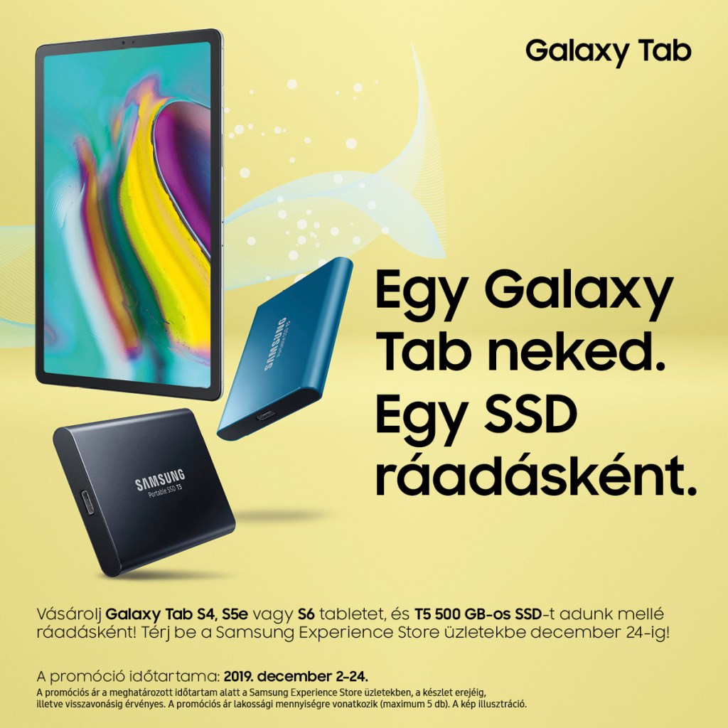 Mielőtt rátérnék, felhívnám a figyelmet, hogy párhuzamosan három promóció is fut december 24-ig bezárólag. Az egyik a felsőkategóriás tabletekre irányuló, melyek vásárlása esetén ajándékba 500GB-os T5-ös SSD jár ráadás gyanánt. A másik az okosórákra fókuszáló, amelyeknek az ára tegnaptól lejjebb kúszott. Közöttük van a Galaxy Watch Active 2 széria is, ami eddig a bevezetési árukon voltak elérhetők. A harmadik pedig a kiegészítőket veszi górcső alá. Egyes termékekre 10%-os, másokra pedig 20%-os a kedvezmény mértéke.