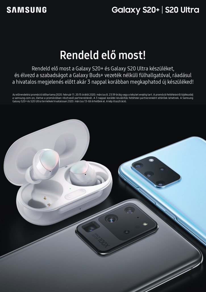 A Galaxy S20-családnál az előrendelési időszak 2020. február 11-én 20 órával elindult, ami 2020. március 9. 23:59-ig tart. Aki ez idő alatt leadja igényét, és a kifizeti a termék teljes árát, azok 3 nappal korábban, már 2020. március 10-től átvehetik a terméket, illetve a Samsung Members-ön keresztül megigényelhetik (2020. április 17-ig) a grátisz (fehér!)Galaxy Buds+-ot, ami mellé jár. A hivatalos megjelenése: 2020. március 13-án lesz. (2020. március 10. és 12 között is van lehet úgy nevezett előregisztrációra, azonban ilyenkor már a Galaxy Buds+ nem jár a termék mellé.)