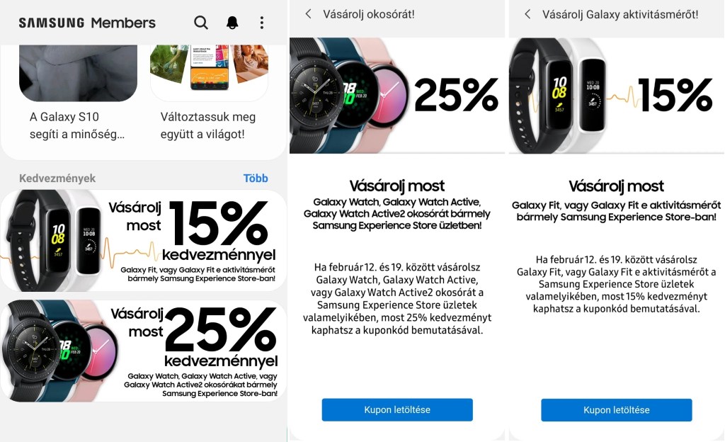 A hét teljes egészében a Galaxy S20 körül forog. A Samsung se készült semmiféle készülék akcióval, nehogy elvegye a reflektorfényt a termékcsaládról. Kijelentésem csak részben igaz, mert valóban nincs okostelefonokra és tabletekre promóció, ellenben az okosórákra és az okoskarkötőkre van. Most azonban nem dobja az ölünkbe a kedvezményt, azaz odadobja, de tennünk kell érte. Szükséges letölteni a Samsung Members applikációt, majd miután a Samsung accounttal a bejelentkezés megtörtént felkeresni a „Kedvezmények” menüpontot, ahol megtaláljuk a szükséges kuponkódok kikérési lehetőséget, hogy az akció éljen. Ha netalántán nem látnátok, akkor kis türelmet, hogy átfusson a rendszeren a bejelentkezésetek!