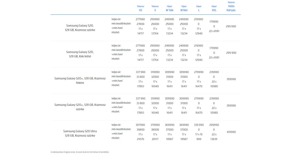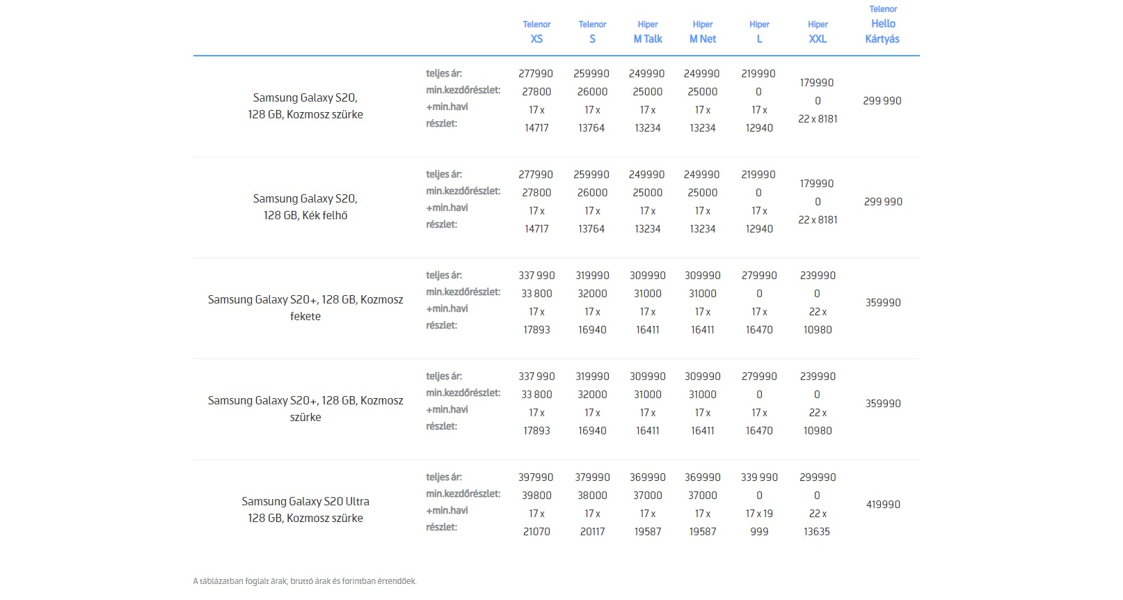 Feltűnhet, hogy Magyarországra csak a 128GB-os változatok érkeznek. Nagyobb tárhelykapacitásúakról egyelőre nincs szó. A Galaxy S20 Ultra lesz csak 5G képes, amit bármelyik hivatalos partnernél lehet előrendelni és megvásárolni; azonban a listán feltűnik a Galaxy S20+ is 5G formában, amit a szolgáltatók kínálatában érhettek el. További érdekesség, hogy a Galaxy Z Flip második SIM foglalata eSIM-ként érhető el.