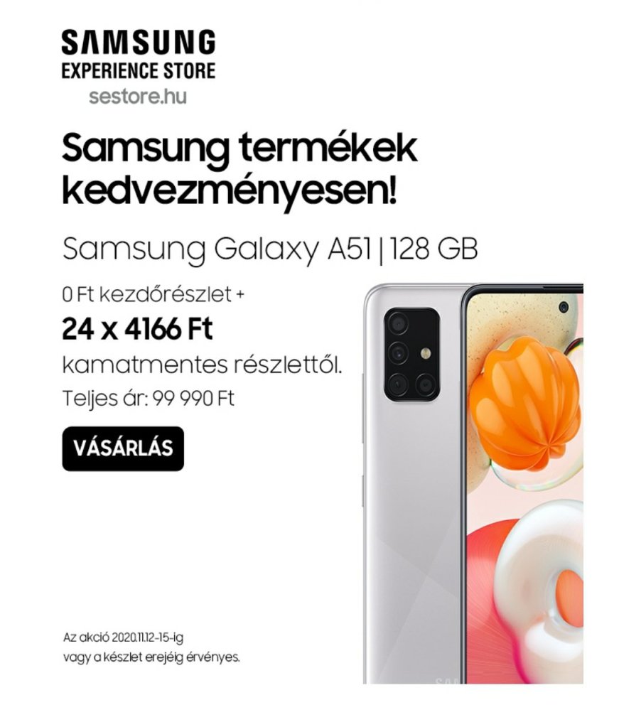 Az idei Black Friday középpontjában kétségtelenül a középkategóriás készülék kerültek. A hazai képviselet úgy döntött, hogy a nemrég behozott nagyobb tárhelyű modellekre is alkalmazta az árlecsapást. A Galaxy A31-nél mindössze 5 ezer forint a differencia a 64GB-os és a 128GB-os modell között. Mindenképpen érdemes megfontolni, melyik mellett döntetek. Árminimumra került a Galaxy A51 is, hiszen ilyen nyomott áron még márkaboltba nem volt jelen.