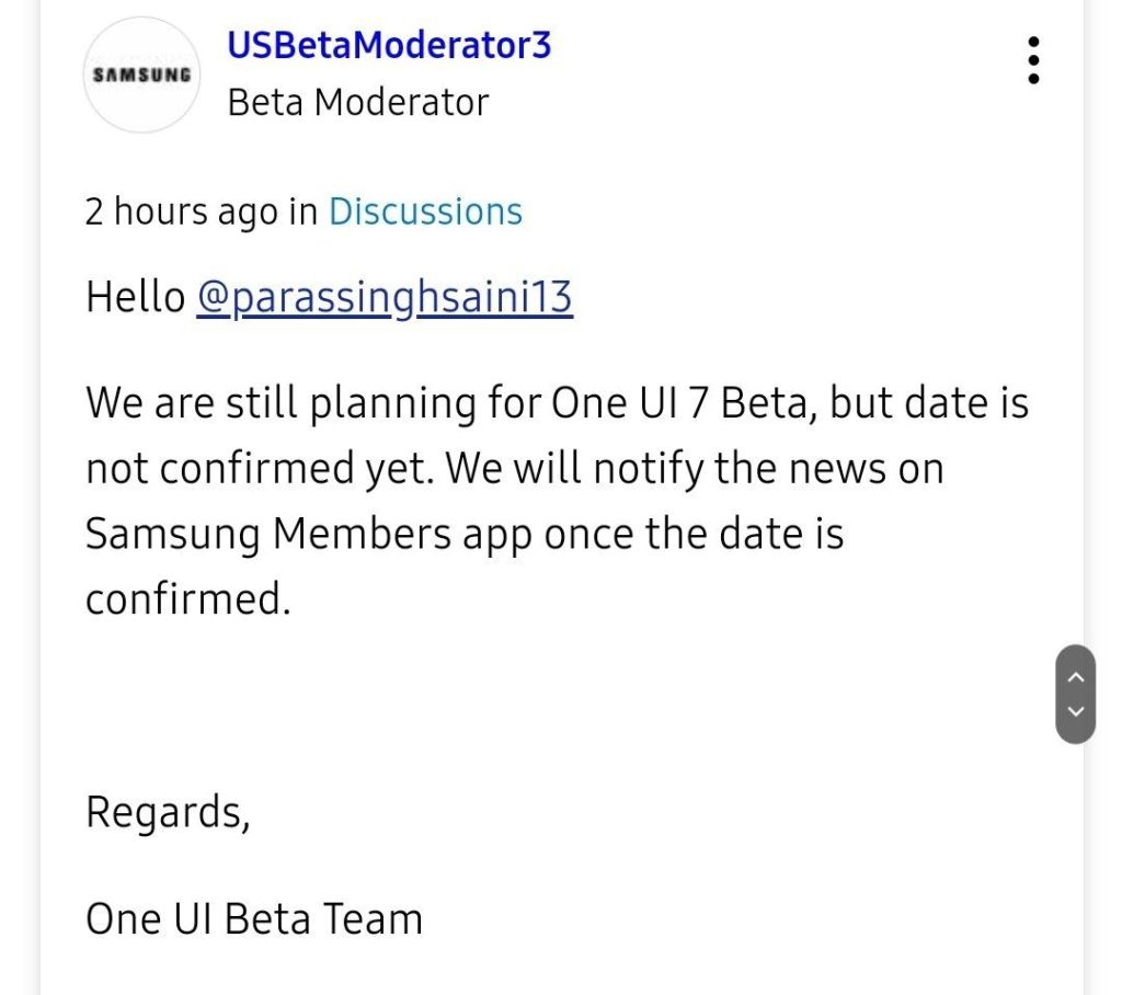 A Samsung One UI 7 béta programja 2024. december 5-én indult, és az Android 15-ön alapuló frissítést hozza el a Galaxy készülékekre. A program kezdetben a Galaxy S24 sorozatra korlátozódott, de 2025 márciusában jelentősen kibővült, több készüléket is bevonva. A béta program célja, hogy a felhasználók tesztelhessék az új funkciókat, és visszajelzést adjanak a Samsungnak a stabil kiadás előtt, amely 2025. április 7-én kezdődött el hivatalosan a Galaxy S24 sorozatra, a Z Fold6-ra és a Z Flip6-ra Európában és Ázsiában, míg az Egyesült Államokban április 10-én.