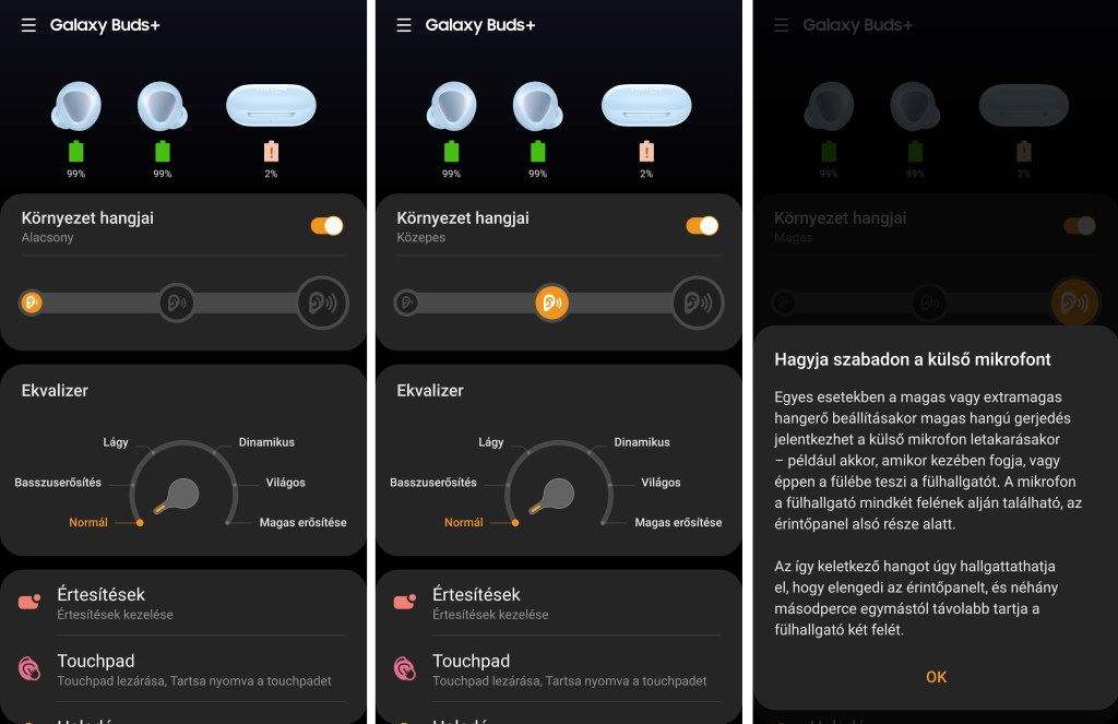 Zárásképpen fel szeretném hívni a figyelmet, hogy az „Ekvalizer” állíthatóság elé beraktak a továbbgondolt „Környezet hangjai” beállítást. Az elődnél három opció (alacsony, közepes és magas) helyett egy csúszka gondoskodott arról, hogy magunknak a legmegfelelőbbet állítsuk be. Most fokozatok vannak, amelynek minőségéért a külső és belső mikrofonok felelnek. Pl.: futáskor vagy más olyan esetekben, amikor a külvilágot azért hallani szeretnénk egy remek megoldás.