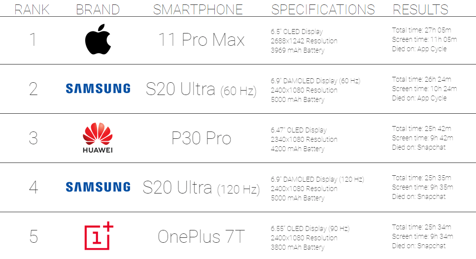 A Galaxy S20 Ultra remek helyen zárt a TOP5-ös listájukon, hiszen még 120Hz-es képfrissítéssel is bekerült oda, hát még 60Hz-cel. Ha pedig valaki mégis csak az alacsonyabb mellett tenné le a voksát, akkor bátran számolhat azzal, hogy a készüléke a 10 órás üzemidőt simán fogja hozni, ami 2020-ban eléggé szép teljesítménynek tekinthető – legalábbis nála már csak egyetlen termék képes többre…