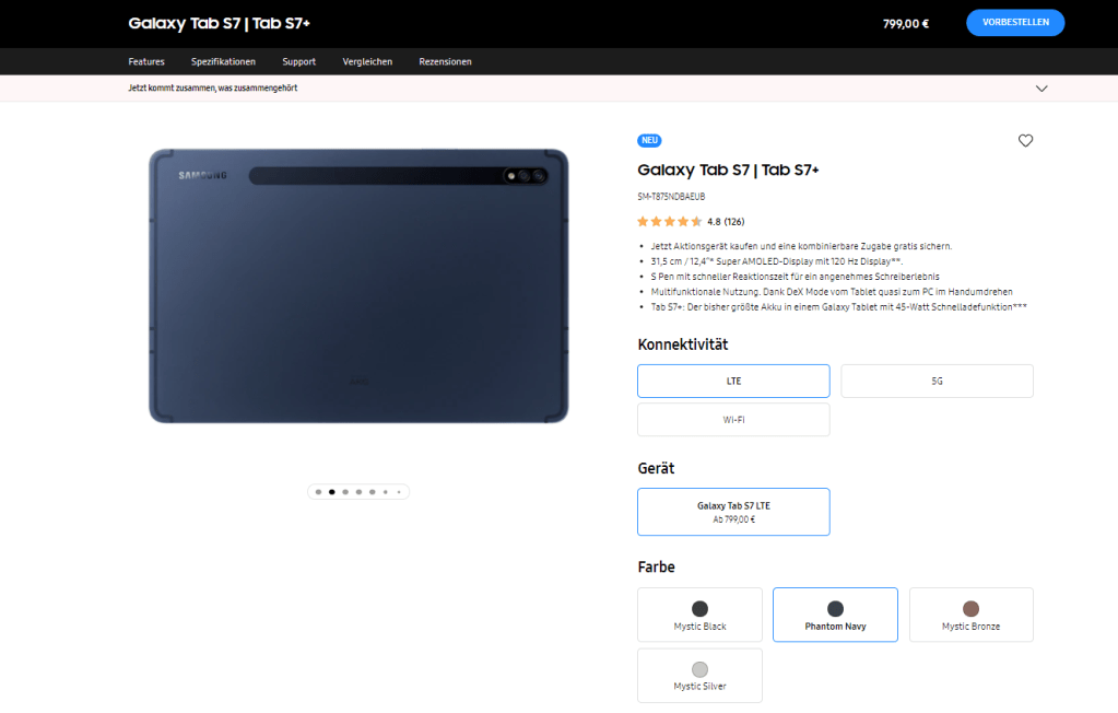 A Galaxy Tab S7 Phantom Navy színe már rendelhető Németországban. Forrás: Samsung DE