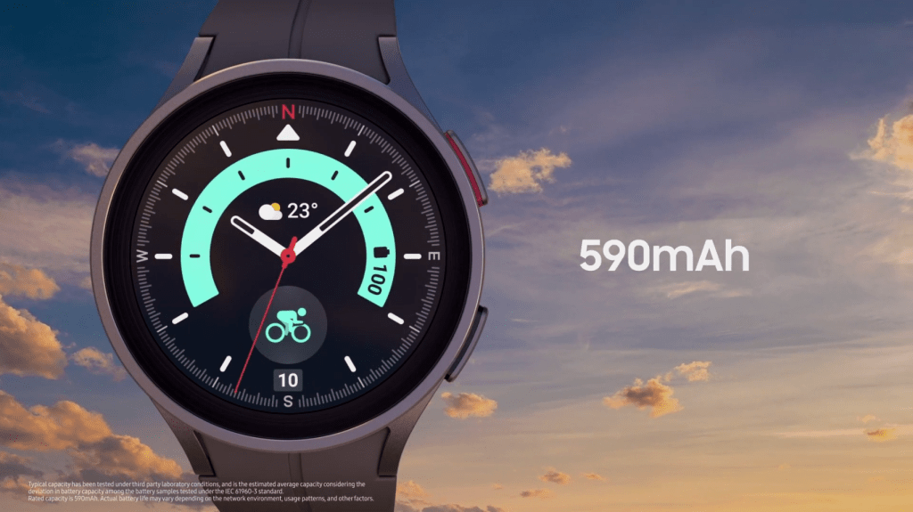 A Samsung állítása szerint, a Galaxy Watch5 Pro az 590mAh-ás kapacitásával 80 órás üzemidőre képes átlagos használat mellett, míg ha folyamatos GPS-t használunk, akkor ez nagyjából 20 órára csökken le. 1,6-szor nagyobb lett tehát a szuflatárolója a Galaxy Watch4 Classic-hoz képest.
