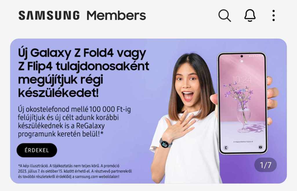 Az igénylés menete annyiban módosult, hogy immáron csak a Galaxy Z Fold4 5G és a Galaxy Z Flip4 5G készülékek tulajdonosainak Samsung Members-ében jelenik meg a kérelmezői kedvezmény. (Ha mégsem lenne így, akkor érdemes megnézni, hogy a legfrissebb változat van-e telepítve az applikációból, valamint a bejelentkezés megtörtént-e a Samsung fiókba, ami elengedhetetlen páros.) A programban való részvétel leadására nincs más felület, így senki se a régi okostelefonján próbálja véghezvinni a folyamatot. A Samsung Magyarország által megküldött ReGalaxy kupon felhasználására, a szabályzat szerint: 2023. július 7. és október 15. között lesz lehetőség. Tehát a vásárlási időszak utolsó napjától számítva még lesz fél hónap a felhasználásra.