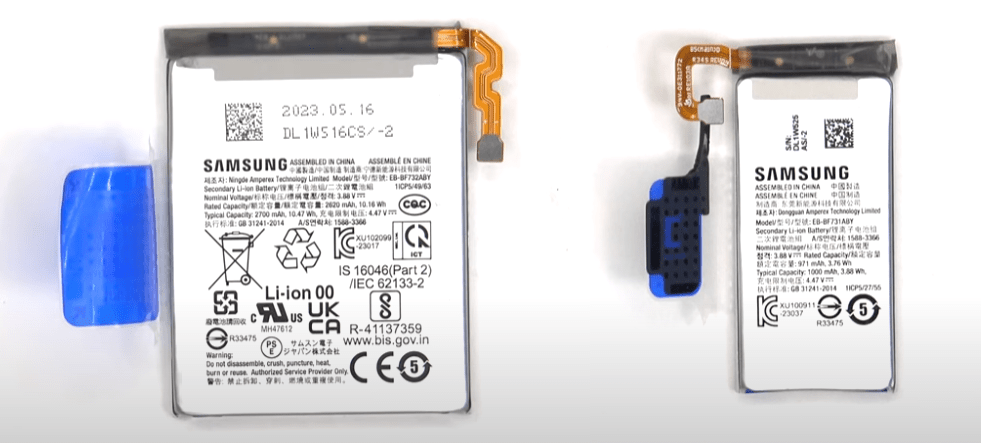 A Galaxy Club által szerzett infókról a SamMobile oldala szintúgy beszámolt, miszerint a kisebbik telep 1.097mAh-ával, míg a nagyobbik 2.790mAh-ával rendelkezik. Kettőjük névleges kapacitásának összértéke 3.887mAh, azaz feltételezhető, hogy a tipikus (avagy a meghirdetett) értéke 4.000mAh-ra lesz.
