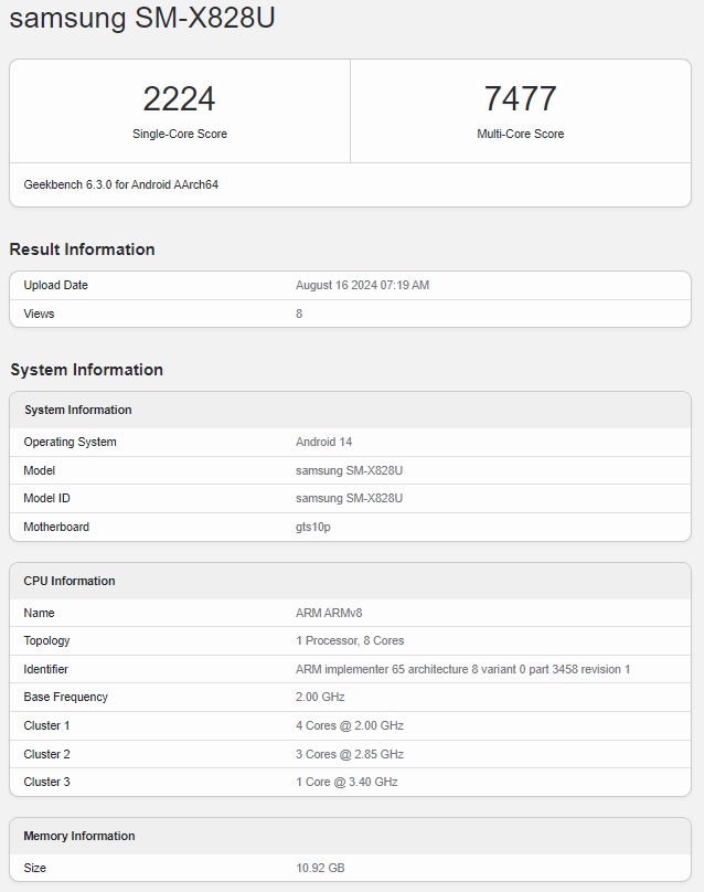 Az SM-F766N, avagy a koreai régióban egy Exynos lapkával szerelt variáns mutatkozott, melynek processzora az s5e9955 projektnéven került berögzítésre a Geekbench oldalán. Ez az az Exynos 2500, amely végül a Galaxy S25-ökbe nem kerül beépítésre alacsony hozamából fakadóan, de a jelek szerint, a kisebb gyártási mennyiséget képviselő Galaxy Z Flip7 5G-be már sikerült feltornászniuk. A 10 magos lapka legerősebb egyke tartománya 3.30GHz-en teszi a feladatát, melyet kiegészít a duplázott 2.75GHz-es klaszter. Az átlagos felhasználásért ötmag felelhet 2.36GHz-en, míg az energiatakarékosért kettő 1.80GHz-en.