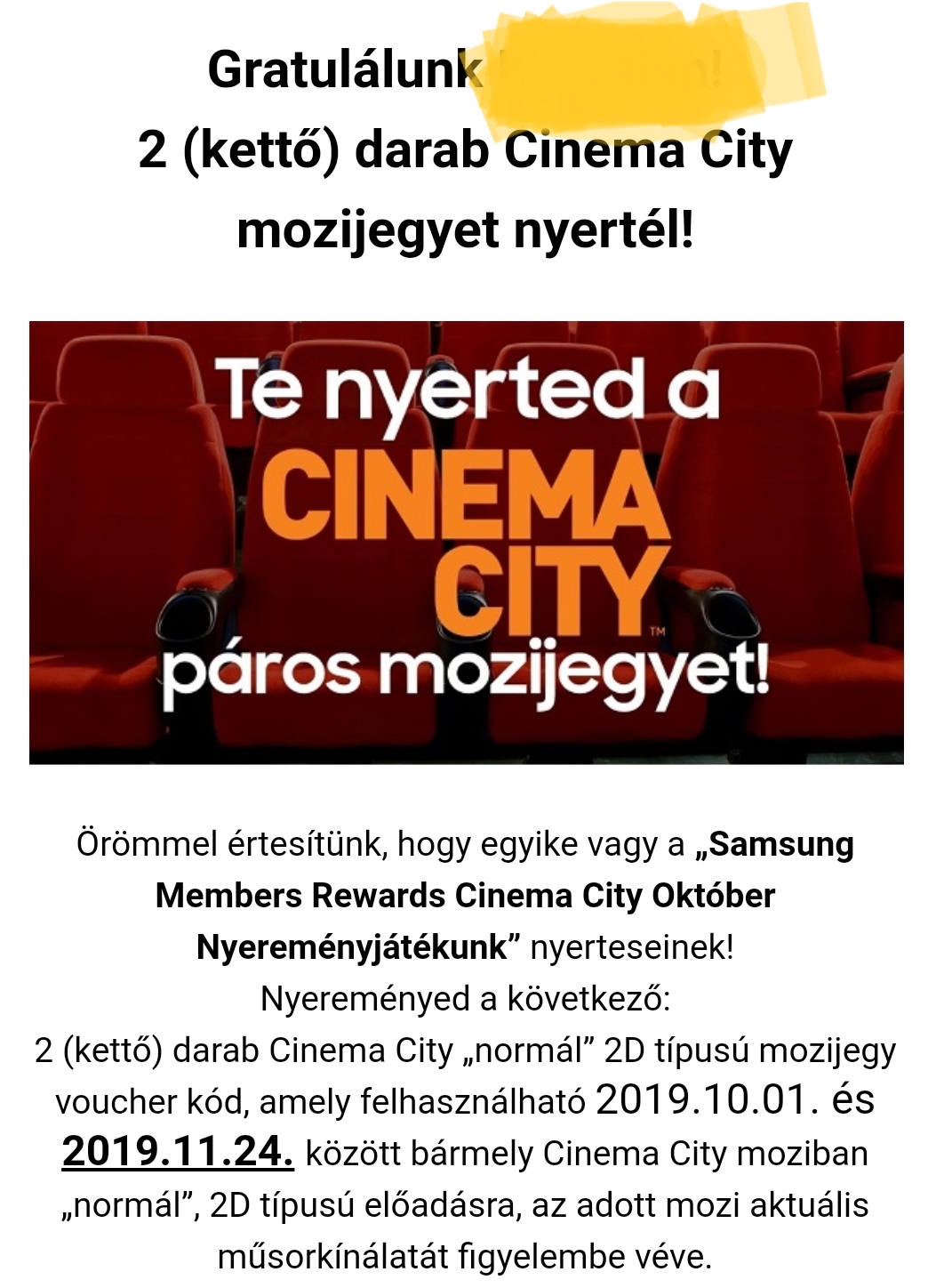 Hónap elején felhívtam a figyelmeteket a Samsung Members alkalmazáson belül zajló nyereményjátékra, melynek lényege abban merült ki, hogy egy regisztrációt követően mozijegyekért játszhatsz. Több ismerősömtől hallottam már, hogy ily módon jutott hozzá egy páros jegyhez, így beszálltam a mókaba és egy regisztrálást követően bizakodtam a legjobban, azaz október végen mosolyra mozdul a szám!