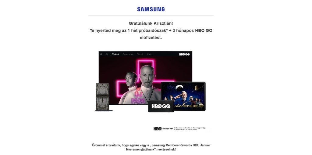 Januárban újra kedveskedett egy hosszabb lefolyású nyereményjátékkal a Samsung a Samsung Members nevű applikációjában. Újfent HBO GO előfizetést lehetett nyerni voucher kód formájában. Ehhez nem kellett mást tenni, mint kitölteni a kérdőívet az adott honlapon és megvárni a játék lefolyását, hogy aztán érkezzen egy e-mail azzal kapcsolatban, hogy megint a szerencsések között tudhatjátok magatokat. Egészen tegnap éjfélig ott volt lehetősége mindenki számára, de mi is kihelyeztük az oldalsávba, hogy ne a kócaolvasóink is képbe lehessenek.