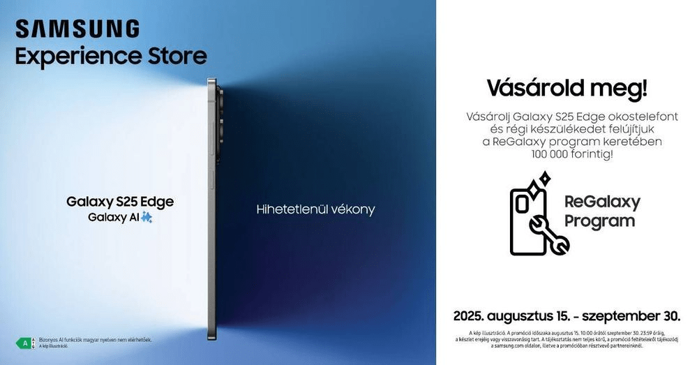 Ne feledkezzünk el arról sem, hogy a Galaxy S25 Edge 5G a Galaxy S25 termékcsalád része, ezáltal újraindítják sokadjára a ReGalaxy programot, amit a Samsung Members applikáción belül érhettek el. Miután megtörtént a vásárlás, igényelhettek egy 100 ezer forint értékű vouchert, ami a korábbi Galaxy S-szériás modellek felújítására jogosit fel. A részletekről már korábban értekeztünk.