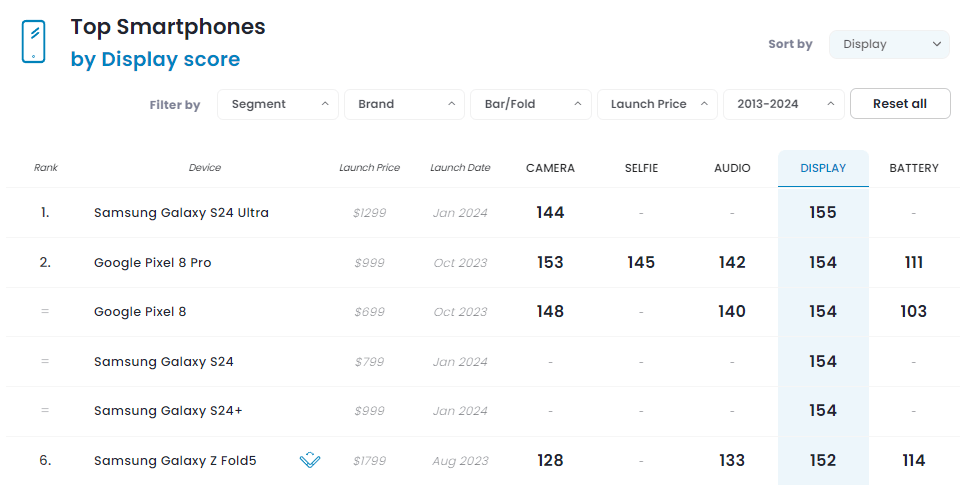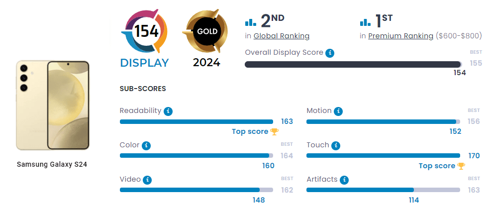 - a Galaxy S24 5G rendelkezik a legmagasabb besorolású kijelzővel a prémium, azaz a 600 és a 800 dollár közötti árfekvésű kategóriában;