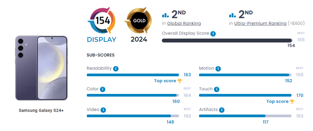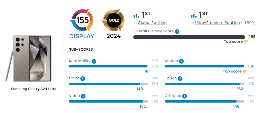 A dobogó legfelsőfokára a Galaxy S24 Ultra 5G készülék állhatott fel, amely sikeresen túlteljesítette a mezőnyt – még ha csak egyetlen egy ponttal is, de nincs holtverseny az aranyéremért. A kritikusai kiemelik, hogy messze a legjobb kültéri élményt szállítja az összes vetélytársához képest. Igazolják továbbá a Samsung állítását, miszerint a csúcs fényereje 2.600 nit körül lehet; így verőfényes napsütésben nincs szükség árnyékolni a kijelzőt, ugyanúgy látható, mint ha éppen felhős lenne az égbolt. Színhűsége sokat javult a megjelenítőnek a Galaxy S23 Ultra után, különösen kültéri viszonyok területén. Ám amivel kiverte a biztosítékot, az a mozgási teljesítmény, avagy a videók lekezelése, ahol új csúcsértéket állított be.