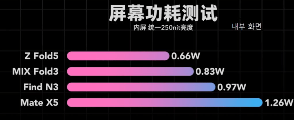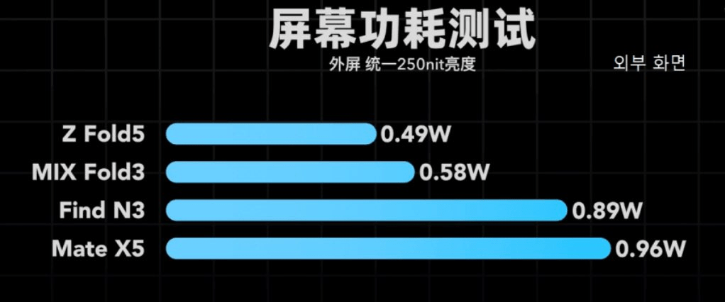 Kezdjük a felállást a külső kijelzőkkel, ahol az Oppo és a Huawei a BOE-től szerezte be a panelt, míg a Xiaomi a Samsung-féle E6 megoldás mellett tette le a voksát. A különbség a két panelgyártó között érezhető és szemmel látható, hiszen a 250 nites egységes vizsgált teszt során utóbbi 0.6W alatt fogyasztott, addig a konkurens megoldás 0.9W-ot is meghaladta. A Galaxy Z Fold5 5G-be épített kijelzőpanel 0.49W energiafogyasztással bírt, azaz a Galaxy S23 Ultra 5G-nél (0.52W) kevesebbre, de a Galaxy S24 Ultra 5G-nél (0.47W) egy kicsit többre volt szüksége.